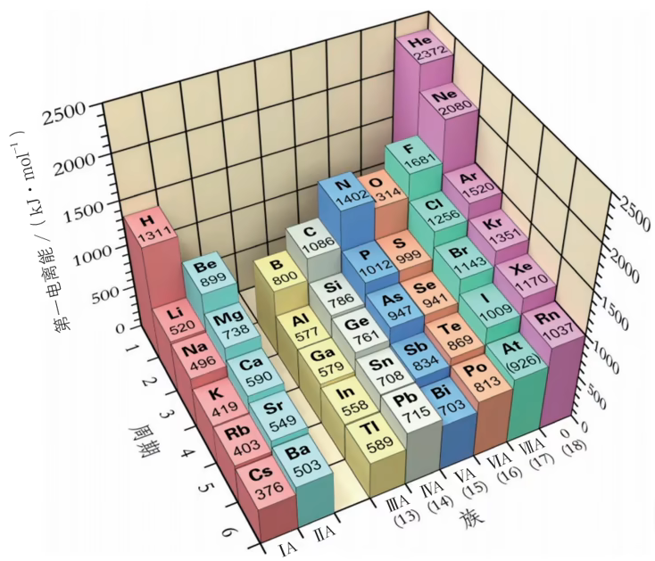 • 同周期 的主族元素具有相同的电子层数,随着核电荷数增加,原子半径逐渐减小,原子核对核外电子的有效吸引力作用逐渐增加,第一电离能呈现增大趋势。因此对同周期元素来说,碱金属的第一电离能最小,稀有气体的第一电离能最大
